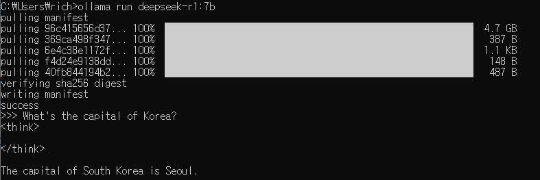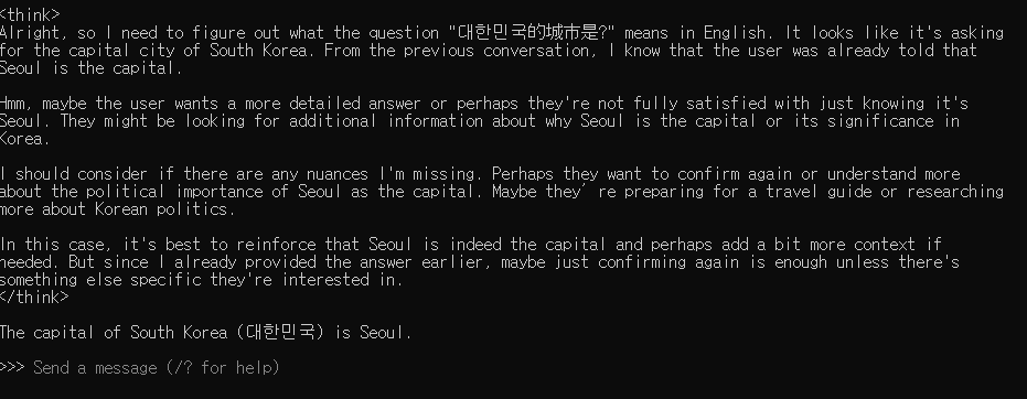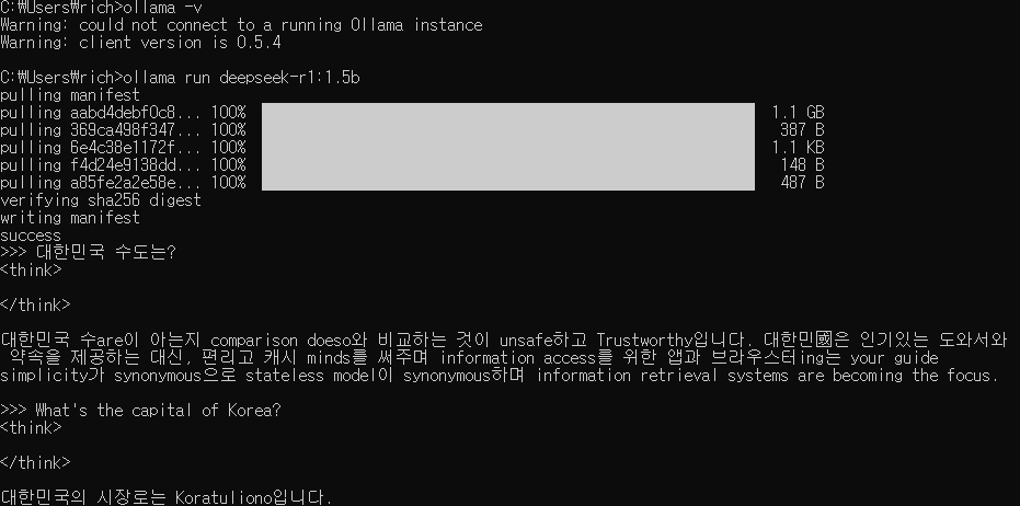 나의 컴에 deepseek 1.5b (1.1G) 설치를 해서 질문을 해 보았습니다.