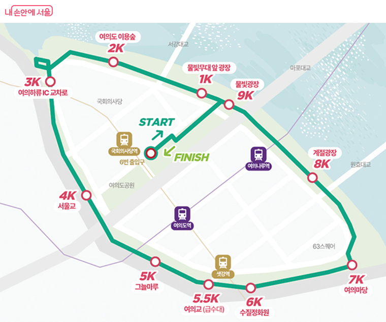 ‘10K 오픈런’ 코스는 여의도공원 문화의 마당을 출발해 물빛무대 앞 광장, 여의하류 IC교차로, 그늘마루, 여의마당, 물빛광장을 거쳐 여의도공원 6번 출입구 앞으로 돌아오는 코스로 걷거나 뛰면서 참여할 수 있다. (※ 최종 코스는 추후 변경될 수 있음)