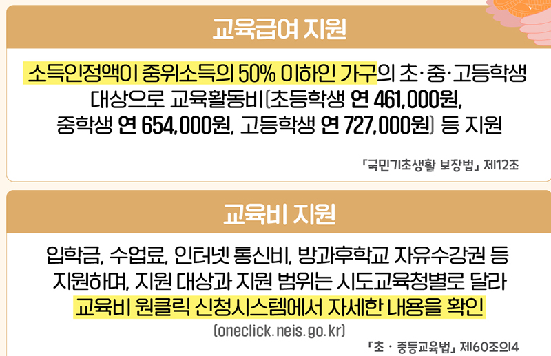 경제적으로 어려움을 겪고 있는 가구의 초·중·고교생에게 교육급여를 지급한다고 합니다.
