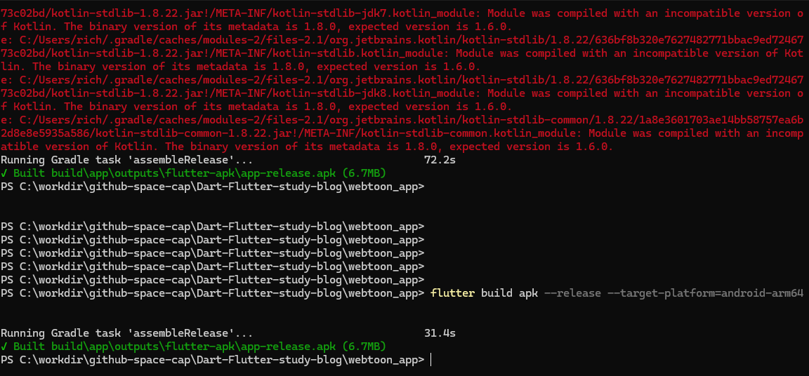 apk 빌드 : 터미널에 flutter build apk --release --target-platform=android-arm64